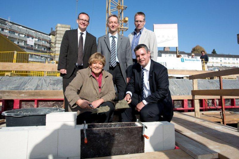 Abellio-Geschäftsführer Ronald Lünser und Oberbürgermeisterin Beate Wilding legen gemeinsam den symbolischen Grundstein der Abellio-Betriebsstelle. Hinter ihnen stehen der Abellio-Projektleiter Sascha Zuk, Geschäftsführer der Projektgesellschaft Hauptbahnhof Remscheid Dipl.-Ing. Werner Wirtz und Dipl.-Ing. Gunter Breidbach, Projektleiter der Stadt Remscheid (v. l. n. r) - Foto AbellioAm 23. Oktober 2012 legte Abellio-Geschäftsführer Ronald R.F. Lünser gemeinsam mit Oberbürgermeisterin Beate Wilding symbolisch den Grundstein für den Neubau der Abellio-Betriebsstelle in Remscheid und mauerte eine Zeitkapsel in das Bauwerk ein. Nach altem Brauch des Bauhandwerks wurden zuvor wichtige Unterlagen des Bauprojekts, wie z.B. der Bauplan, einige Geldmünzen und eine Tageszeitung in die Kapsel gelegt. Sollte das Bauwerk jemals abgerissen werden, erinnert es den Finder an den ursprünglichen Bauherren und an die feierliche Veranstaltung zum Baubeginn.