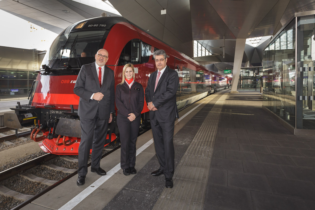 Die Erweiterung der Railjet Flotte von 51 auf 60 Garnituren ist abgeschlossen: Die 60. Garnitur wurde heute von Siemens Generaldirektor Wolfgang Hesoun an den ÖBB Vorstandsvorsitzenden Andreas Matthä übergeben. Für die Reisenden bringen die neuen Züge – die auf der Weststrecke zwischen Wien und Salzburg bis 11. Dezember schrittweise die Intercity-Garnituren ablösen – deutliche Vorteile: Sie profitieren vom höheren Fahrkomfort, inklusive kostenlosem Railnet, dem neuen onboard Portal mit WLAN, Service und Infotainment, von besserer Information über die Fahrgastinfo-Monitore, kulinarischer Verpflegung im Bordrestaurant und von einem Kinderkino für die jüngsten Fahrgäste. Insgesamt haben die ÖBB 145 Millionen Euro in die neuen Garnituren, die von Siemens Österreich gebaut wurden, investiert. Mit dieser Anschaffung haben die ÖBB in den vergangenen zehn Jahren mehr als zwei Milliarden Euro in die Modernisierung des Fuhrparks und damit in mehr Komfort für die Fahrgäste investiert.