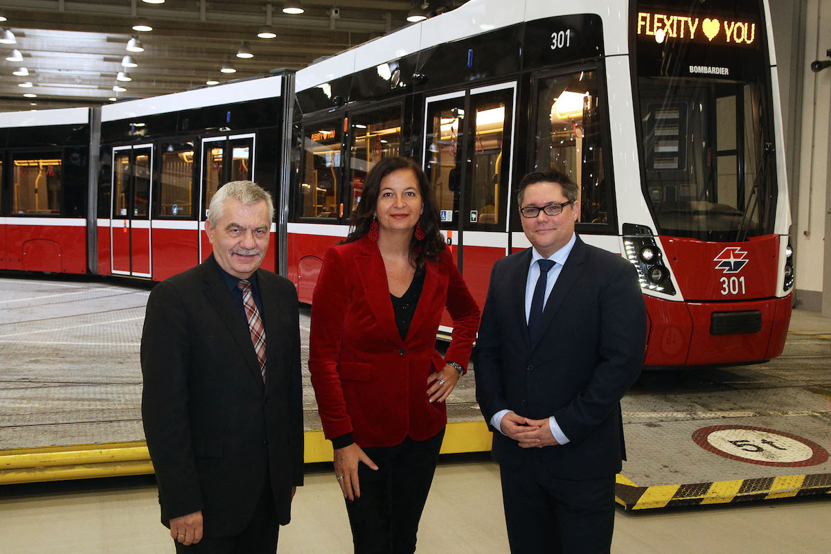 Öffi-Stadträtin Ulli Sima präsentierte heute gemeinsam mit den Wiener Linien und Bombardier den ersten, komplett fertigen FLEXITY Wien. Kurz vor Jahresende 2017 wurde die neue Straßenbahn für Wien im Werk von Bombardier in Wien-Donaustadt fertiggestellt und an die Wiener Linien übergeben. Seit einigen Tagen laufen erste Tests am Betriebsgelände der Wiener Linien in Simmering, dann folgen intensive Testfahrten im Öffi-Netz. Einstweilen fährt die Bim noch ohne Passagiere, Ende 2018 startet der Betrieb mit Fahrgästen. Nach Abschluss aller Tests und der behördlichen Bewilligung soll der FLEXITY ab Ende 2018 mit Fahrgästen unterwegs sein.