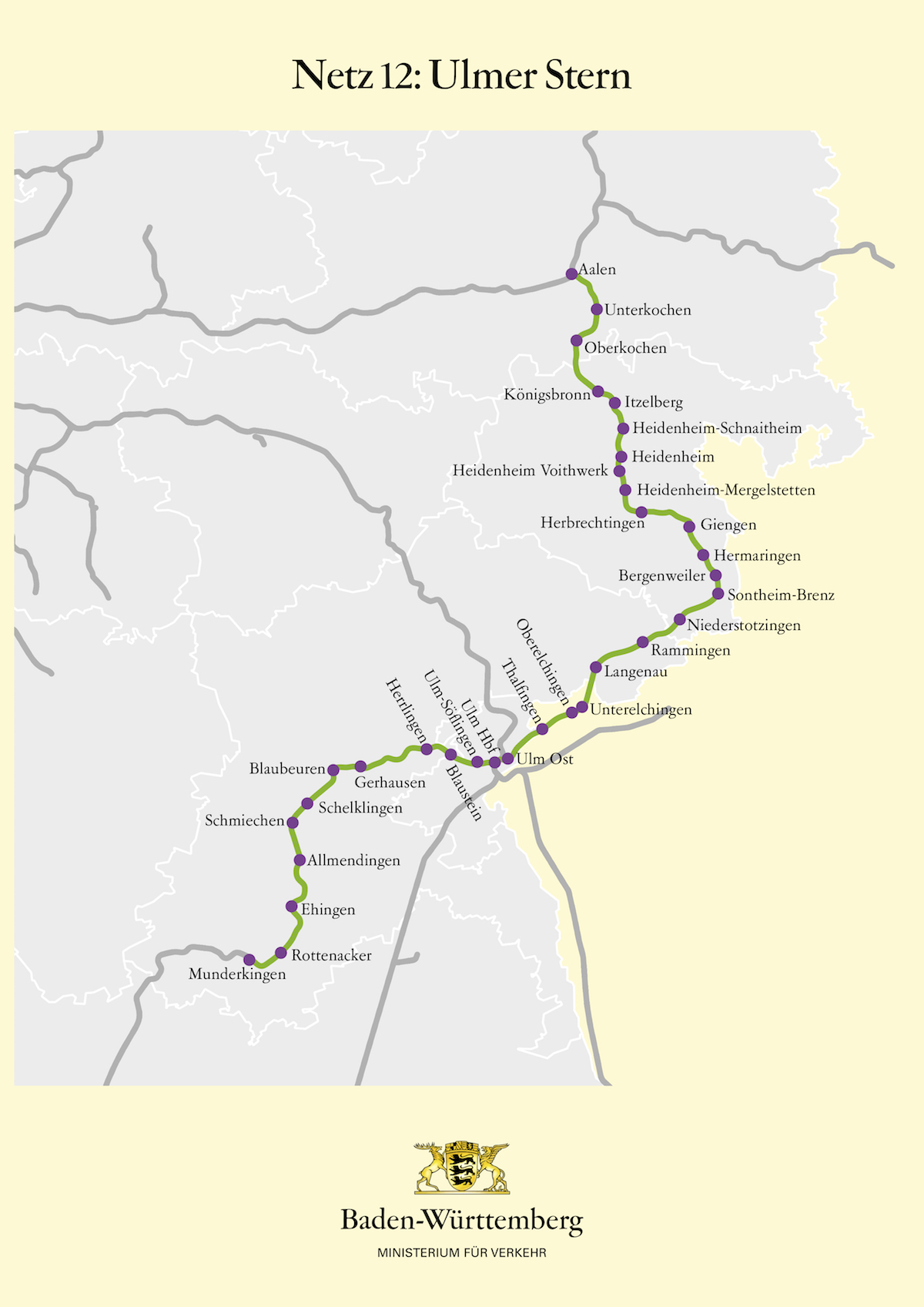Das Netz 12 umfasst den Regionalexpress (RE) Ulm-Aalen, die Regionalbahn (RB) Ulm-Langnau und die RB Ulm-Munderkingen. Nicht enthalten sind der Interregio Express (IRE) Ulm-Aalen und der IRE/RE Ulm-Sigmaringen-Donaueschingen. Diese Leistungen wurden bereits im Netz 5 an die DB vergeben. Im Netz 12 wird grundsätzlich das heutige Angebot weitergefahren. Verbesserungen wird es in den Tagesrandlagen und am Wochenende geben. Dort werden Taktlücken geschlossen. Insbesondere wird das Angebot in den Abendstunden verbessert: