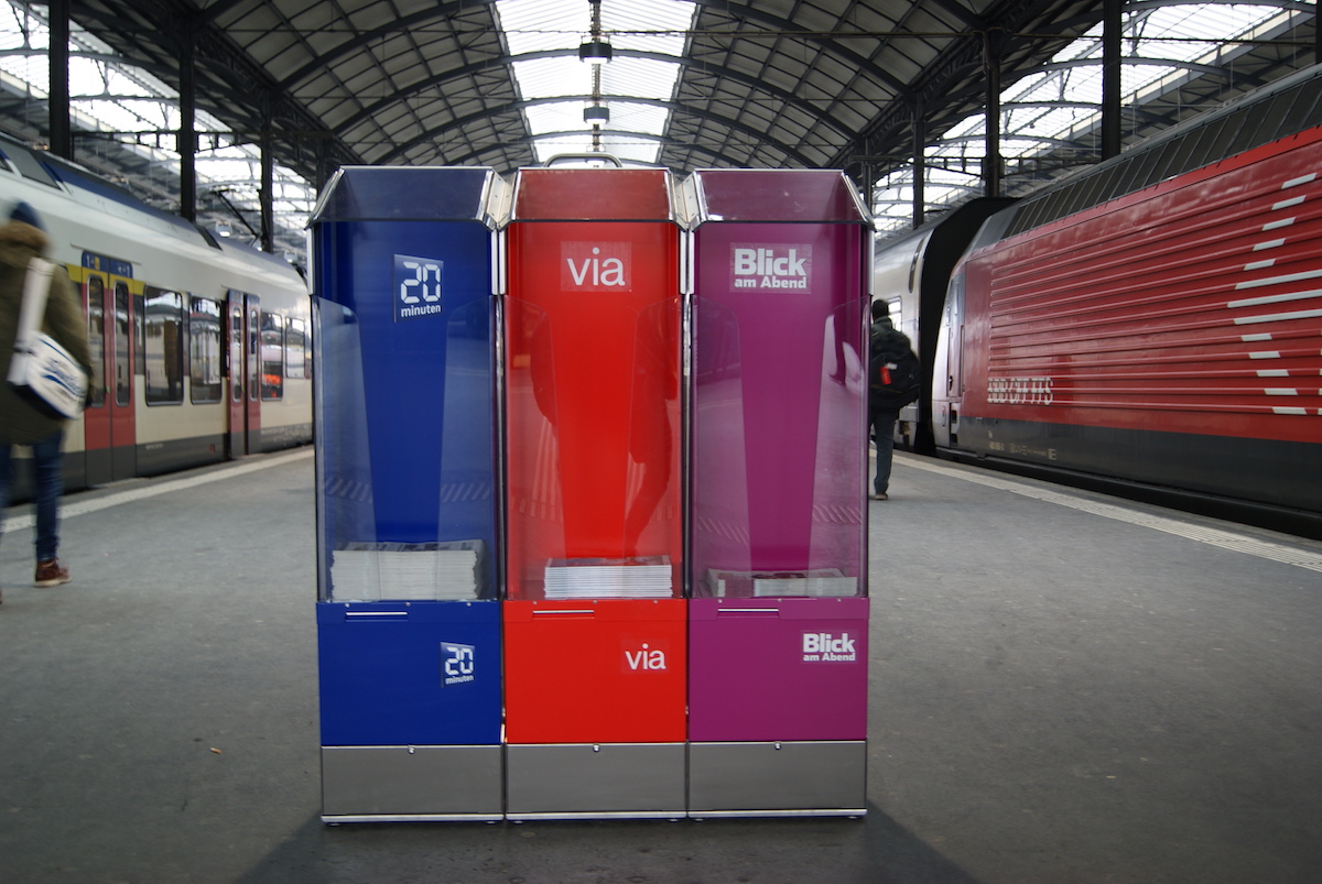 Ab heute werden in Zürich Hauptbahnhof und an den Bahnhöfen Lausanne und Neuenburg neue Zeitungsboxen für die Pendlerzeitungen 20 Minuten und Blick am Abend sowie für das Reisemagazin Via aufgestellt. Bis Anfang Mai werden schweizweit über 470 SBB Bahnhöfe mit den neuen Verteilboxen ausgerüstet, die durch die Stiftung alfaset in La Chaux-de-Fonds produziert werden.
