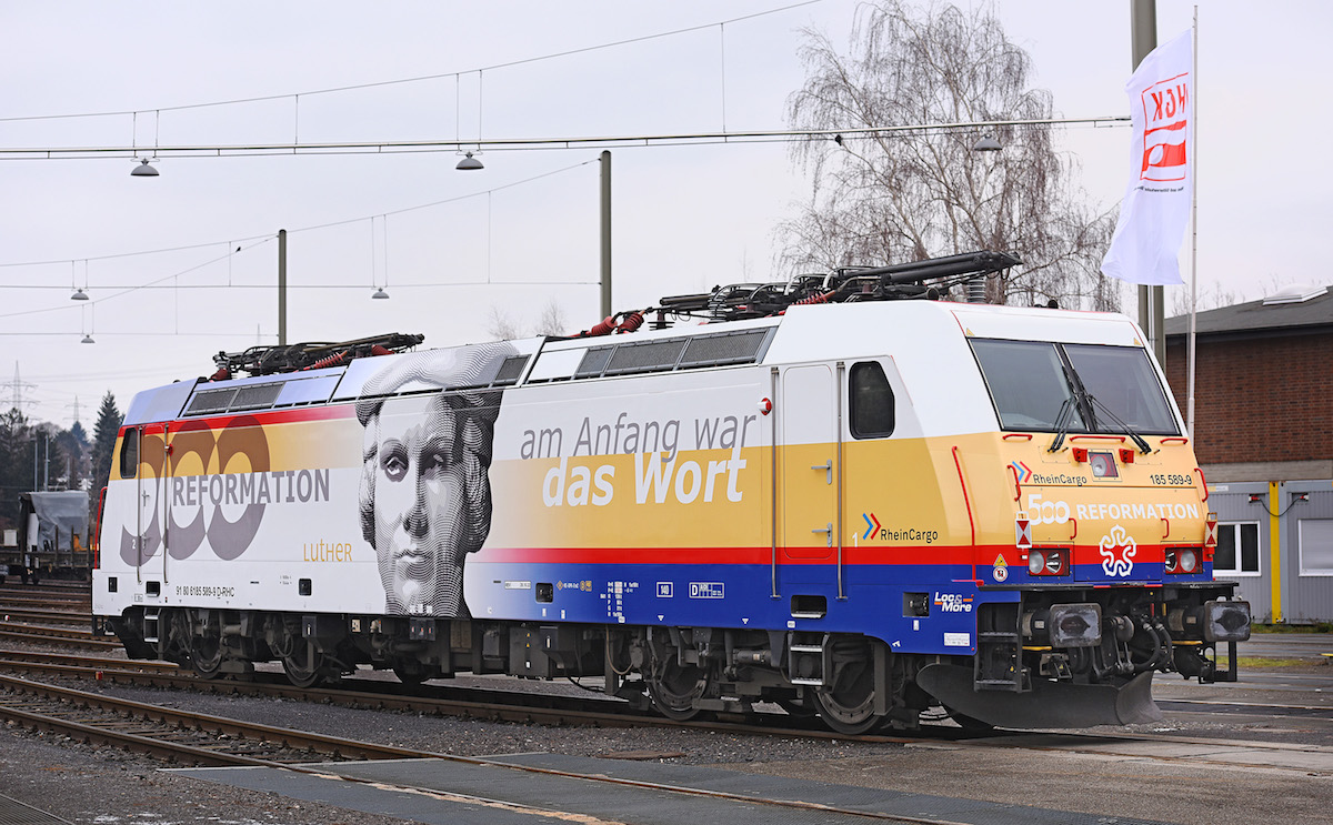 Der Logistikdienstleiter RheinCargo schickt im Luther-Jahr 2017 eine besondere Lokomotive auf die Strecke. Eine E-Lok der Baureihe 185 wurde mit einem aufwendigen Design zum Thema „500 Jahre Reformation“ versehen und ist ab sofort im bundesweiten Schienengüterverkehr im Einsatz.