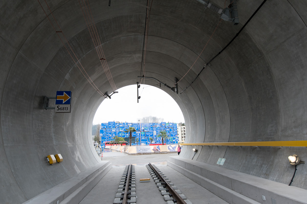 Eine visionäre Tunnel-Installation in der Schienenhalle vermittelt die Illusion eines Tunnelblicks. Sie lässt die Besucherinnen und Besucher vom Eingangsportal in den Tunnel hineinschauen. Darin befinden sich statische und interaktive Informationselemente.