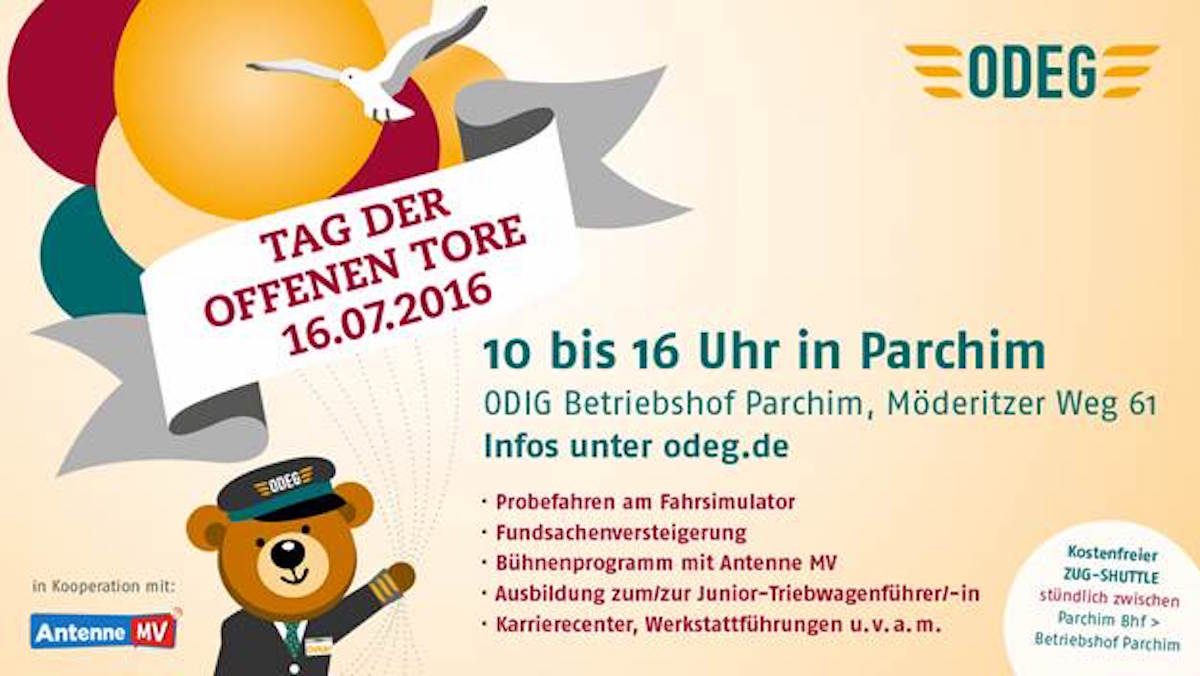 Am 16. Juli 2016 öffnet die ODEG – Ostdeutsche Eisenbahn GmbH die Tore ihres Betriebshofs der Fahrzeuginstandhaltung in Parchim, Möderitzer Weg 61. Pünktlich um 10 Uhr wird feierlich die westmecklenburgische Werkstatt des modernen Eisenbahnunternehmens für alle ODEG-Fans, Liebhaber und Interessierte geöffnet.